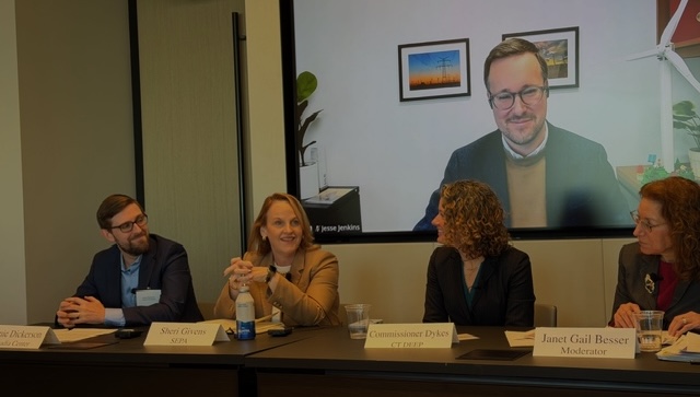 (L to R) Acadia Center's Jamie Dickerson, SEPA's Sheri Givens, CT PURA Commissioner Dykes, Princeton Professor Jesse Jenkins (on screen) and Roundtable Co-Moderator Janet Gail Besser. Photo courtesy of Maggie Slane.