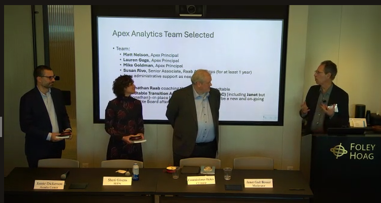 Public Utility Commissioners Carrie Gilbert (Maine), Staci Rubin (Massachusetts) and Ron Gerwatowski (Rhode Island) with Roundtable Co-Moderator Janet Gail Besser. Christine Guhl-Sadovy, of the New Jersey Bureau of Public Utilities, participated remotely.